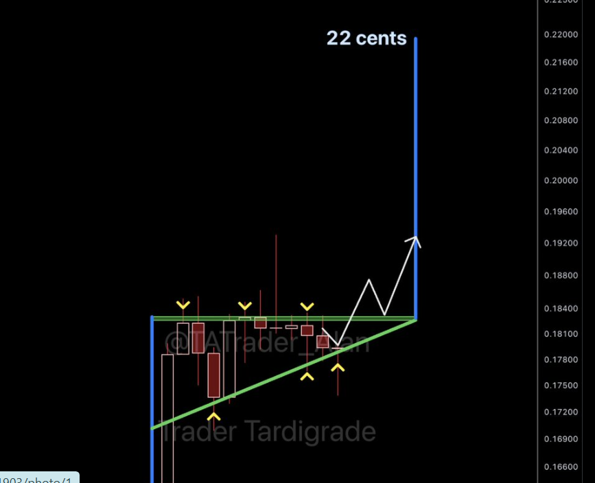 Trader Tardigrade also noted the formation of a Bull Pennant on the 12-hour chart, a technical formation typically associated with upward trends. This pattern suggests a potential short-term price target of $0.22.