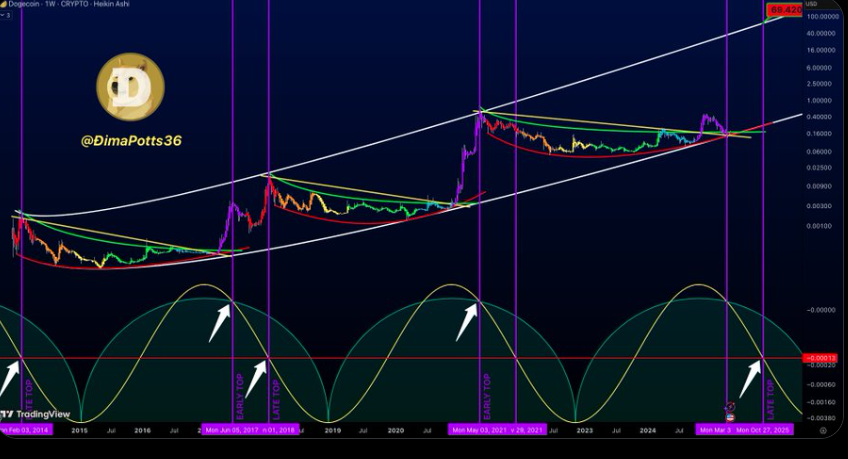 Analyst Dimapotts observed recurring patterns in Dogecoin's price history, using a custom indicator to identify consistent cycle peaks. These peaks occurred around 2014, 2017, 2018, and 2021. While the 2021 cycle saw a major peak early on, the new cycle beginning in 2025 raises questions about a potential second peak in 2026.