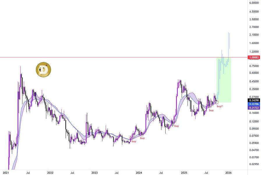 The $1 mark is still the community’s psychological target, representing Dogecoin’s evolution from a cultural joke into a recognized market force. Analysts note that the coin’s current structure is quite similar to the previous accumulation phases that led to major rallies.