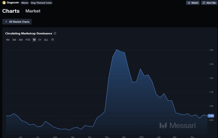 After a downturn earlier this year, Dogecoin's market dominance has stabilized for the first time. April saw a sideways trend with minimal price variation, suggesting a weakening bearish force.