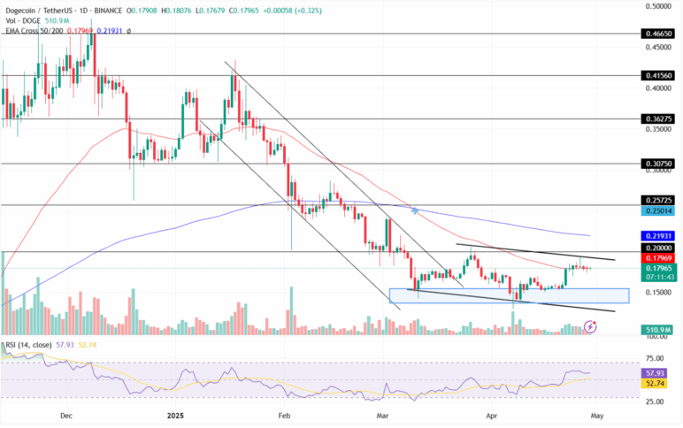 A bullish scenario could see Dogecoin retest the $0.20 resistance level. Sustained price above this level could push it towards $0.25 in May.