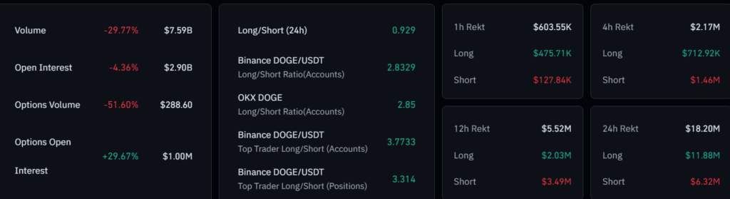 - Dogecoin open interest surged 23.52% in 24 hours, reaching $2.76B, exceeding its 15% price increase.