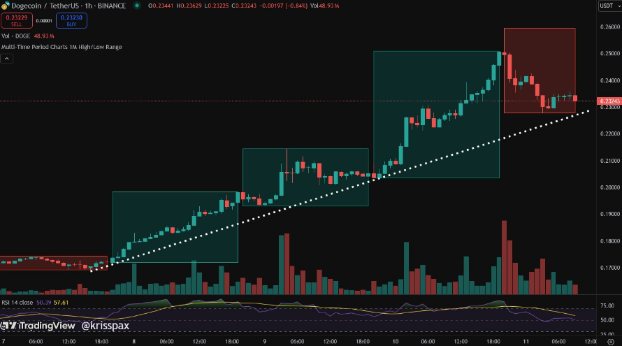 Dogecoin (DOGE) has garnered significant attention following a 15.69% price rally, pushing its value to $0.2375. Market data reveals high trading activity and positive sentiment. Traders are currently monitoring the $0.26 level as a potential breakout point. The meme coin has maintained support above key levels, and futures markets show increasing open interest, fueling expectations of a new upward trend.