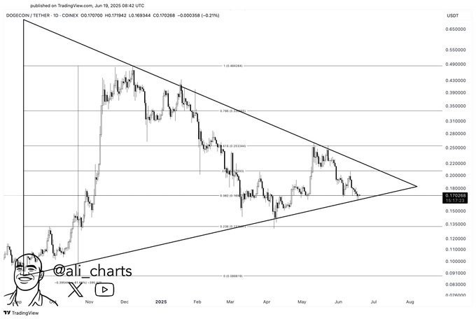 Crypto analyst Ali Martinez has pointed out that Dogecoin's price is approaching a critical juncture. His analysis highlights a symmetrical triangle pattern, characterized by a descending resistance line established since November 2023 and an ascending support line dating back to October 2023.