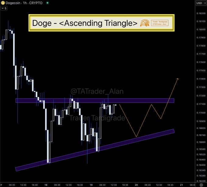 Trader Tardigrade has identified an ascending triangle forming on the hourly timeframe, with resistance around $0.172 and increasing support. This short-term setup suggests that Dogecoin's price could break out above $0.1725 if the pattern holds.
