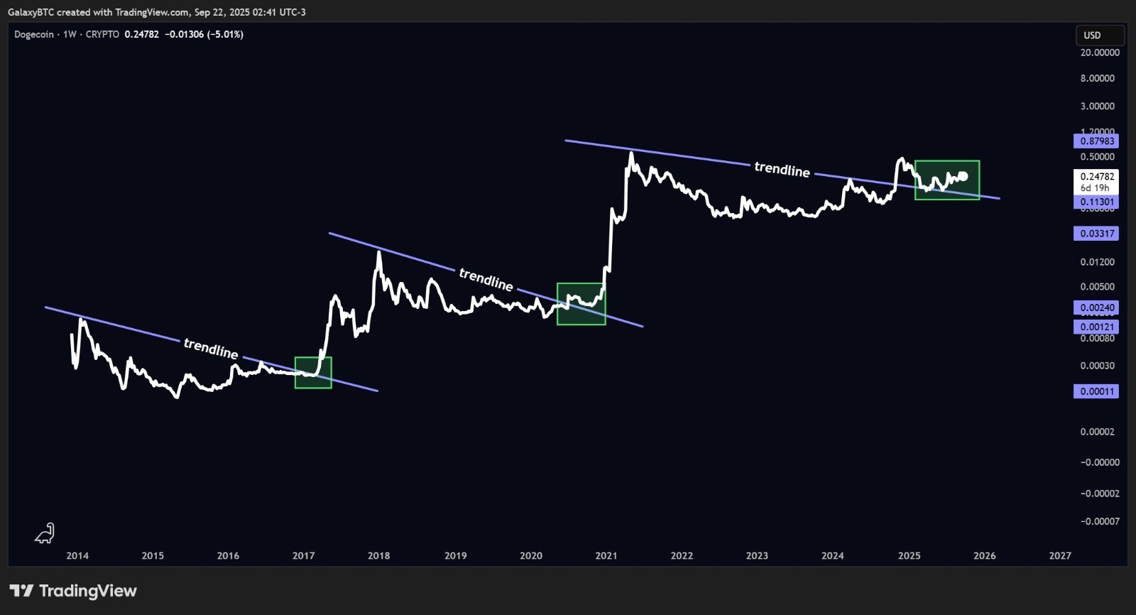 Structurally, Dogecoin's chart has been experiencing a repetitive pattern historically followed by parabolic breakouts. Analyst Galaxy pointed out that the memecoin tends to concentrate around lines of descending resistance before it breaks out and subsequently moves rapidly upward. This happened in 2016-2017 and in 2020-2021 when both events stimulated historic runs.