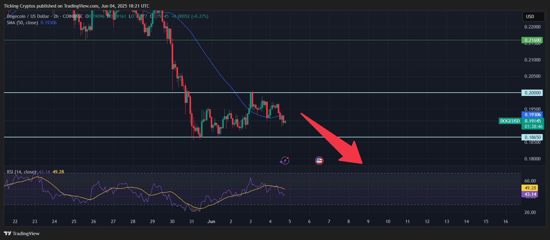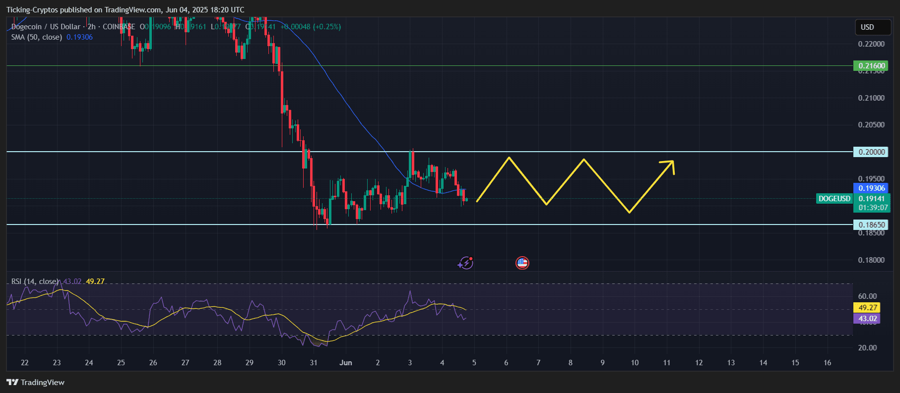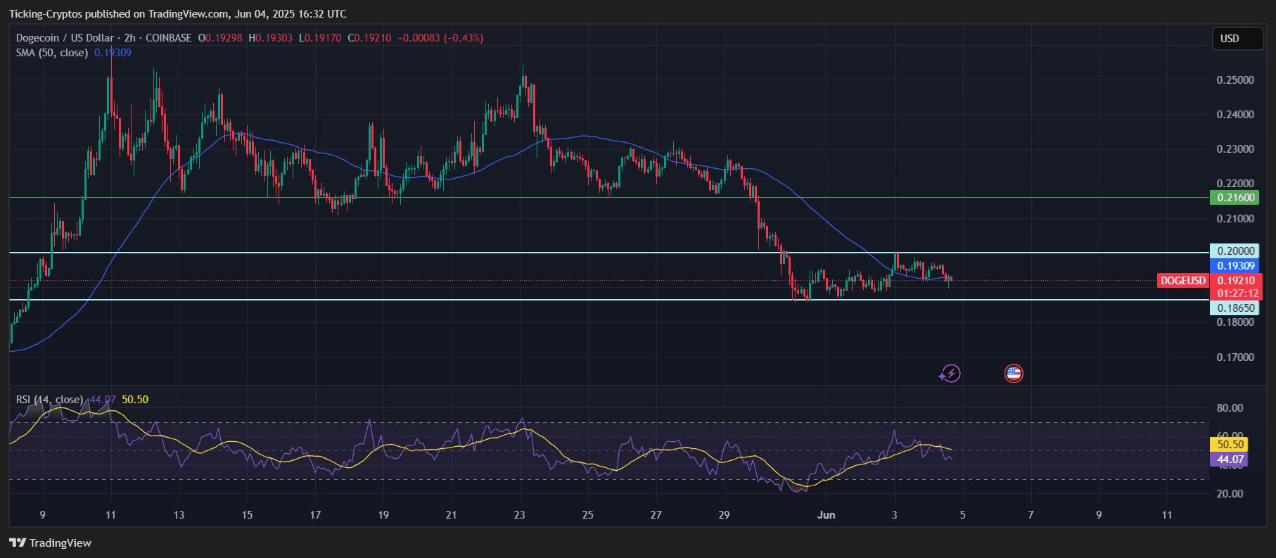 As of June 4, 2025, Dogecoin (DOGE) is currently trading at $0.19210 against the US Dollar, reflecting a slight decrease of 0.43% in today's trading. This popular meme cryptocurrency is navigating a pivotal price range between $0.18650 and $0.21600. The market appears to be consolidating after a notable downtrend from higher price points.