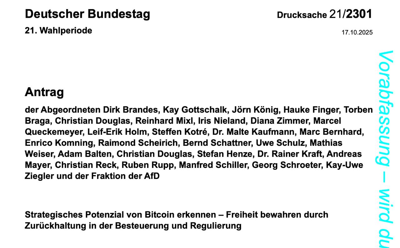 Germany’s largest opposition party, Alternative for Germany (AfD), has filed a formal motion in the Bundestag urging the government to officially recognize Bitcoin as a strategic digital asset.