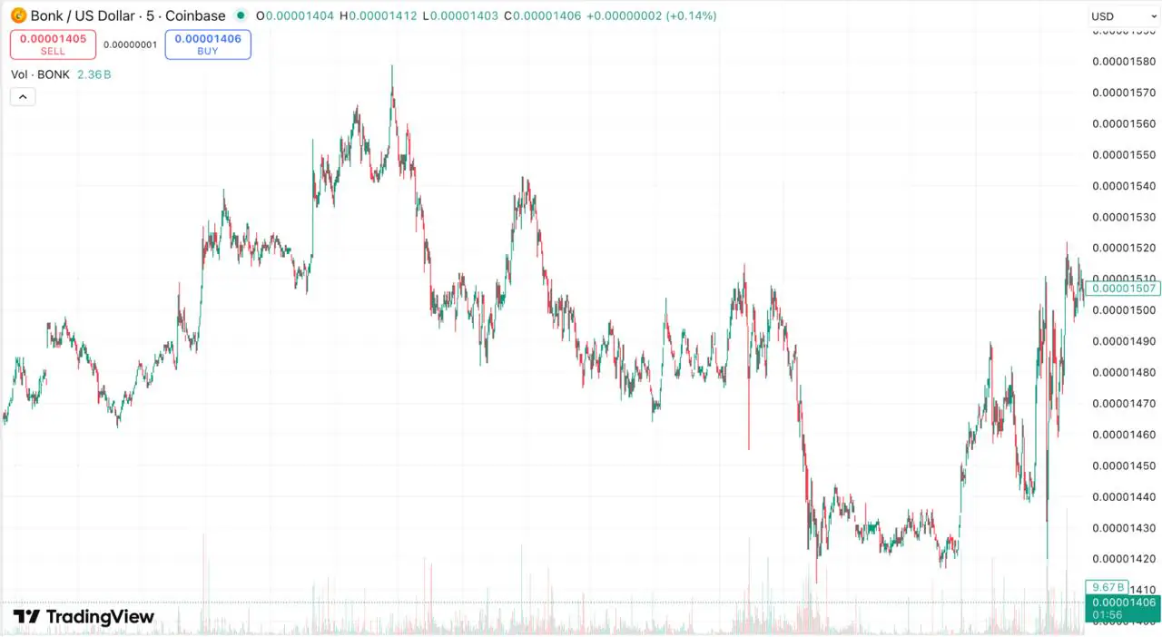 The chart shows a higher low forming, an early sign of renewed strength. The $0.0000143–$0.0000144 zone is now key support. If demand holds, BONK could push back toward $0.0000146 and beyond.