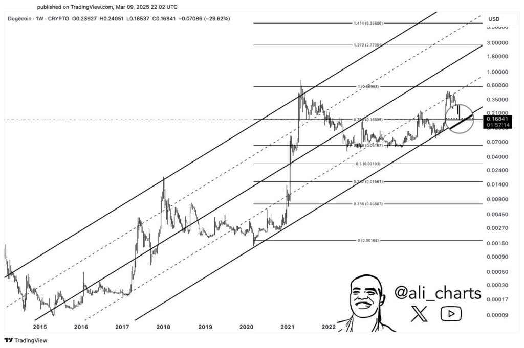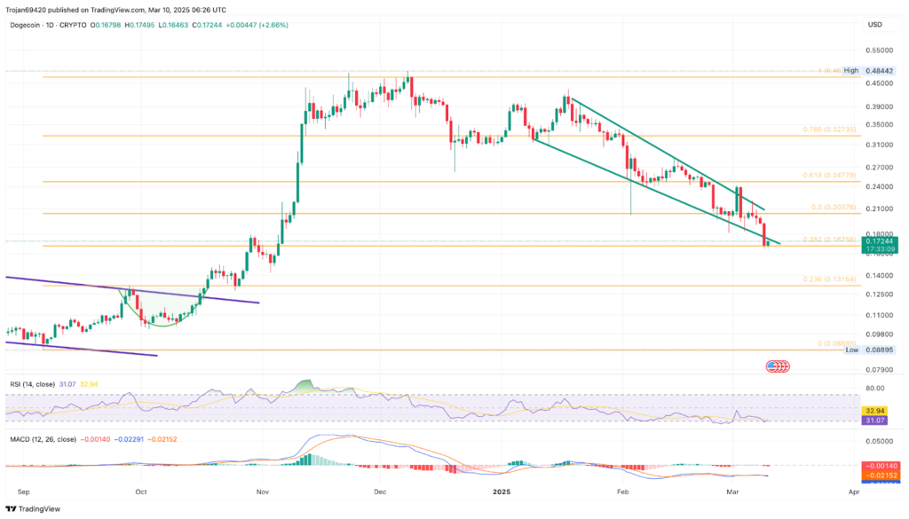 A recent sell-off pushed Dogecoin below a falling wedge pattern, resulting in a 12% decline. This formed a bearish engulfing candle, reinforcing the downward price movement. The price has reached the 38.20% Fibonacci retracement level at $0.1675, a key support level for bulls.