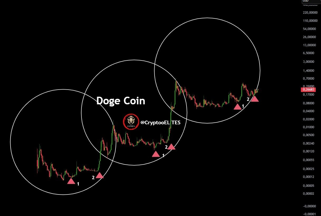 Moreover, analysts identified that DOGE is about to explode in a bullish way. Analyst CryptoELITES focuses on a repetitive 1-2 pattern that has been seen traditionally before price increases. The present trading within $0.26 and $0.35 is a reflection of the previous structures that resulted in parabolic gains, which could be an indication that history is about to reenact itself.