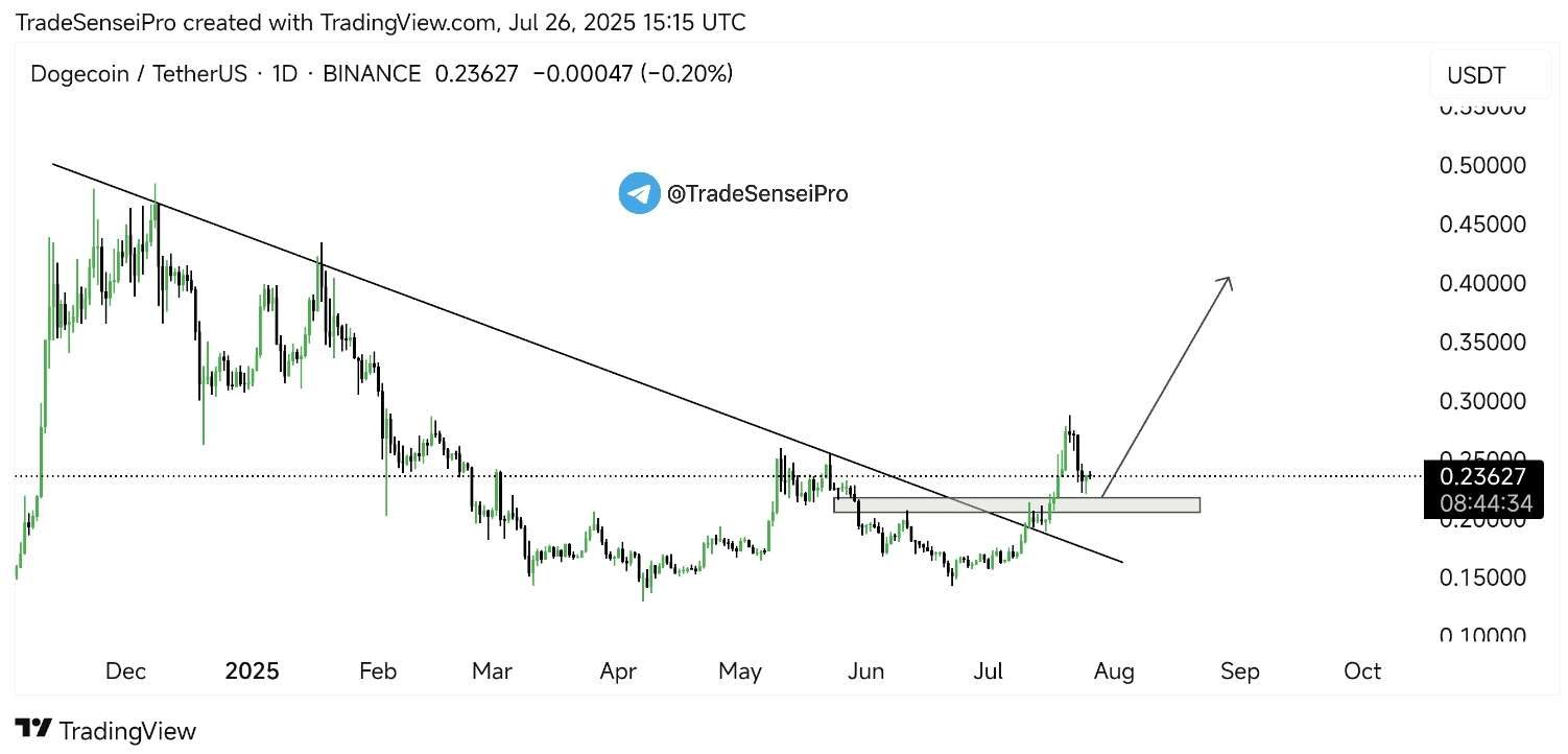 Dogecoin has revisited a price point, slightly above $0.23, that has previously been associated with significant upward price movements.