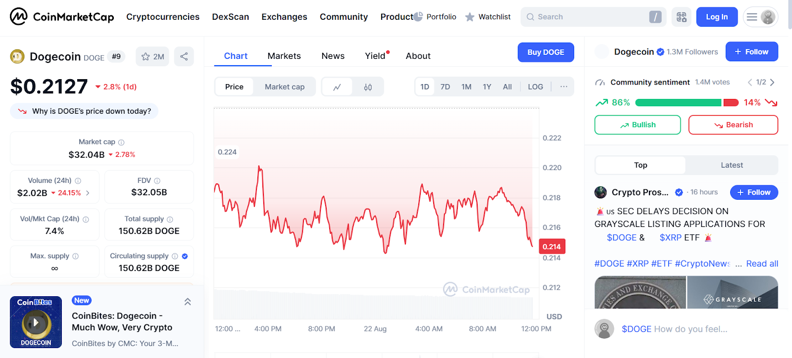 Dogecoin is trading near $0.22, and renewed ETF filings like Grayscale’s DOGE Trust are driving speculation that Dogecoin could jump toward $1, marking over 300% gains. Chart patterns point to resistance clusters around $0.24 to $0.25, with a clean break potentially opening a path to $0.70 or even higher. ETF approval could deliver fresh institutional capital and rocket Dogecoin into the spotlight again.