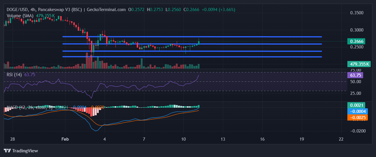 Technical indicators on DOGE's 4-hour chart point towards potential further price gains. The Moving Average Convergence Divergence (MACD) and Relative Strength Index (RSI) exhibit bullish signals.