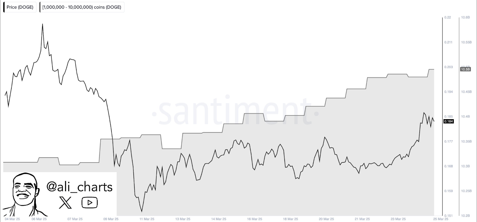 According to Santiment data shared by analyst Ali, wallets holding between 1,000,000 and 10,000,000 DOGE tokens have accumulated over 200 million tokens in the past two weeks. This accumulation, despite increased volatility, suggests growing investor confidence and points towards a potential strong bullish move that could break above the recent bearish range.