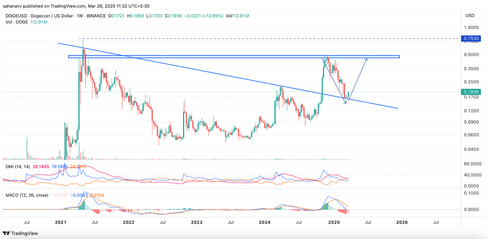 Dogecoin's weekly chart indicates a significant price retracement may be complete, suggesting a potential return to resistance levels. While the price faced rejection at $0.48 earlier this year, current market dynamics suggest buyers are preparing to push the price beyond this range. The weekly MACD shows decreasing selling pressure, potentially leading to a bullish crossover. Similarly, the DMI is also showing signs of a bullish crossover, further supporting a potential shift from the bearish trend.