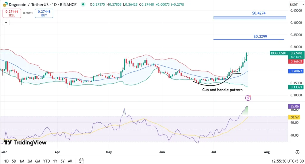 The breakout from the cup and handle formation suggests a potential target near $0.3299. With sustained momentum, Dogecoin could potentially reach $0.4274. The Bollinger Bands are widening, confirming increased volatility and strong buying pressure. The Relative Strength Index (RSI) currently stands at 85.06, indicating extremely overbought conditions.