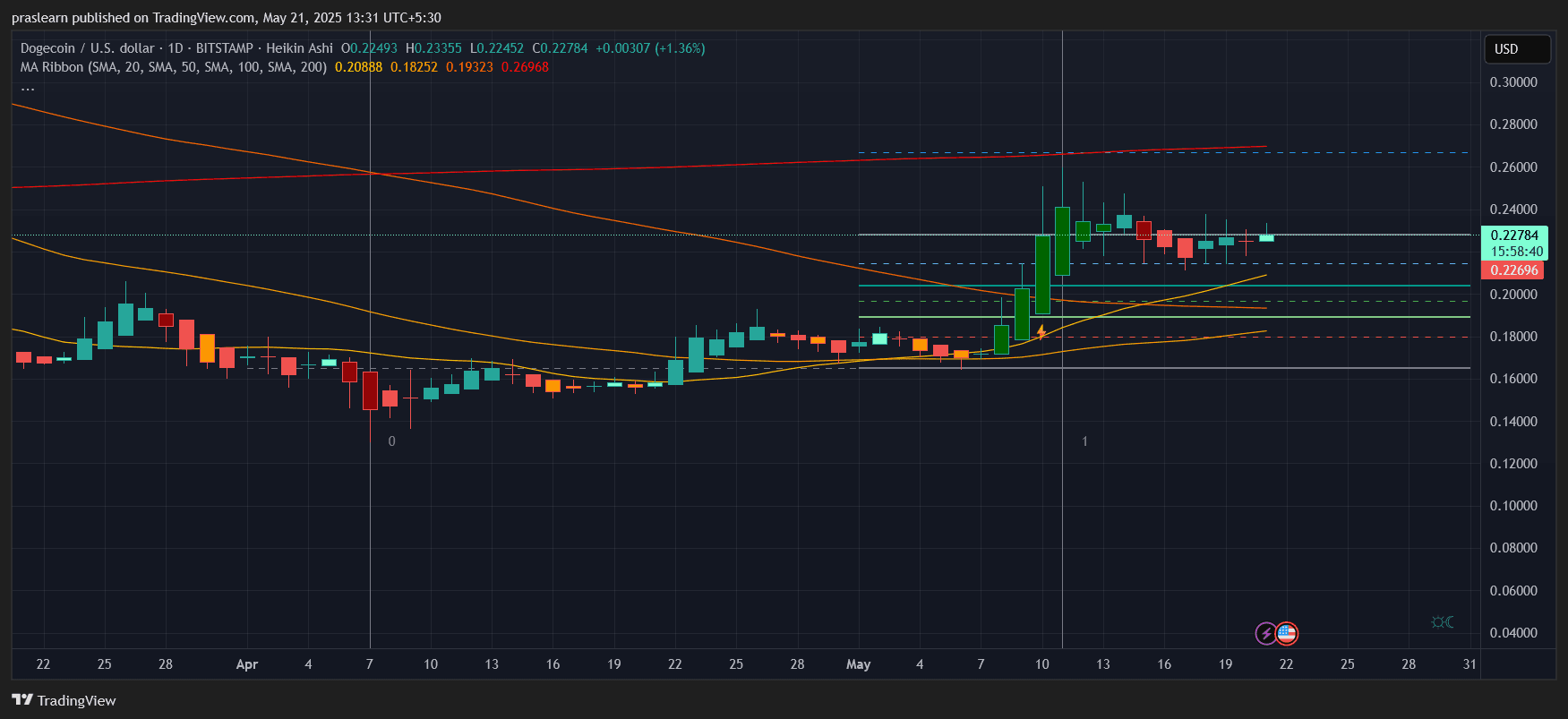 The 20-day moving average sits at $0.208, with DOGE comfortably above. Historically, sustained trading above the 20-SMA has preceded further upward movement. The last breakout from this level (May 9th) propelled DOGE from $0.19 to $0.29 – a more than 52% increase.