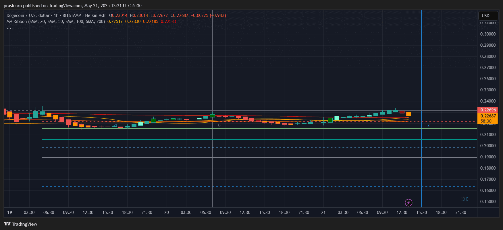 The hourly chart reveals a recent rejection from $0.2301, a level tested repeatedly in the last 24 hours. The subsequent pullback to $0.2266 rests near a cluster of short-term moving averages (SMA 20 to 100) between $0.223 and $0.225, creating a support ribbon.