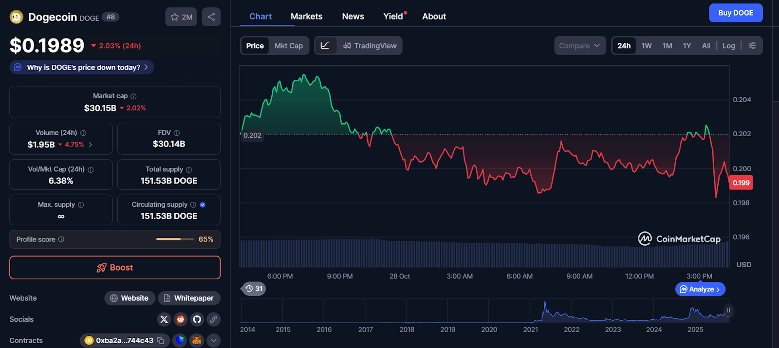 Dogecoin (DOGE), the original meme coin, continues to hold its spot among top digital assets, trading around $0.20 with a market cap of $30.3 billion, according to CoinMarketCap.