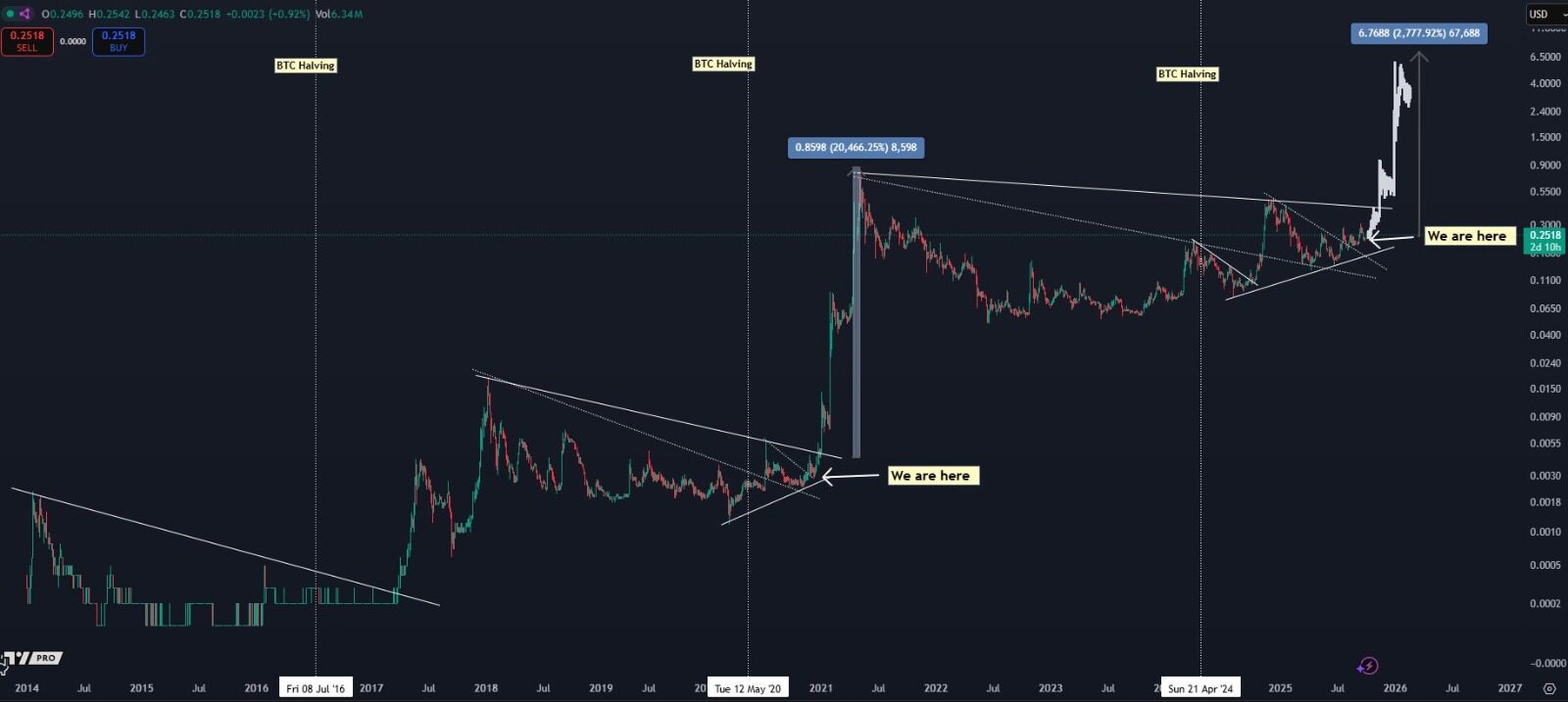According to analyst KALEO, the long-term arrangement of the asset is closely related to the past Bitcoin halving cycles. Every 50% slump in 2016 and 2020 was accompanied by an accumulation phase, followed by a sharp parabolic surge in subsequent months. The current framework resembles the past, and DOGE has broken above a multi-year resistance. This technical breakout shows that momentum could accelerate, leading to a surge to the $6.90 level.