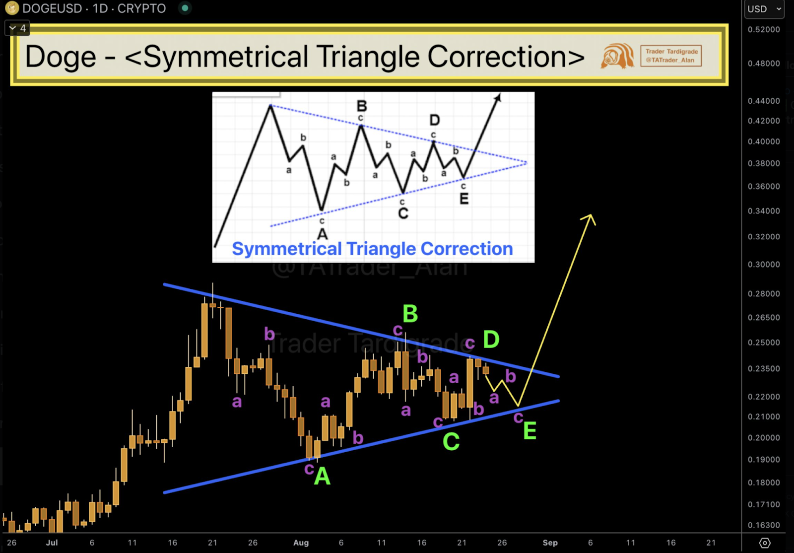 Wave B appears extended, which is common in such setups, while the E wave is nearing completion. He suggests that once this wave ends, a motive wave upward could follow, pushing Dogecoin into a bullish rally.