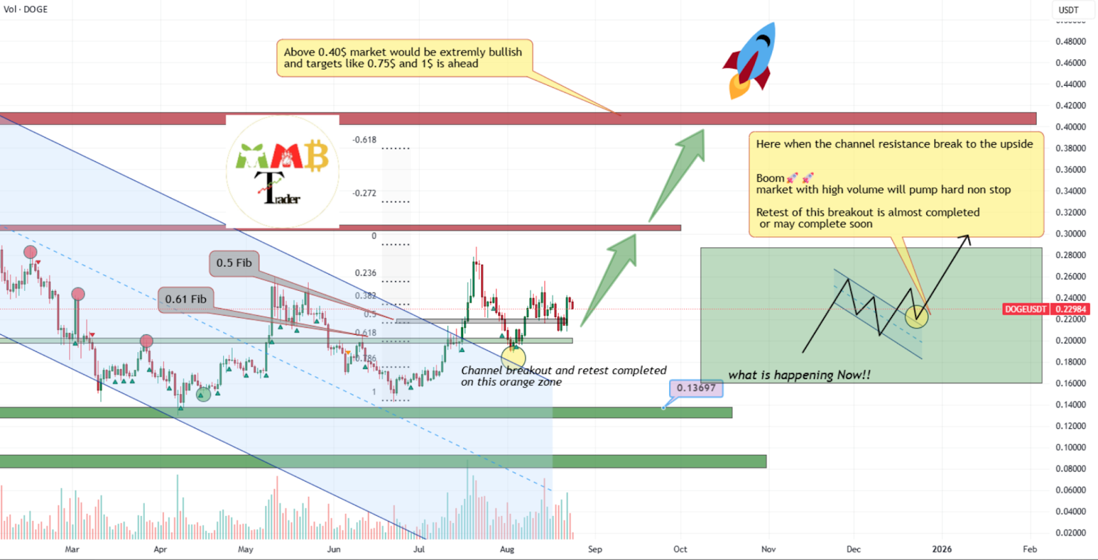 Another analysis shows Dogecoin has broken out of channel resistance and is retesting support near $0.22–$0.23. This retest is considered an important confirmation before a potential rally resumes.