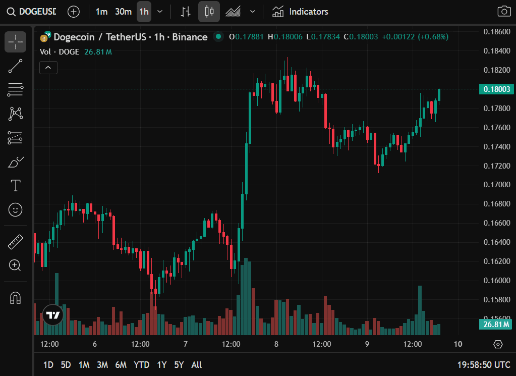 Dogecoin trades at $0.1810, showing a 3.68% daily rise and keeping a $27.47B market cap, but growth feels uncertain. The price has bounced between $0.1716 and $0.1799 before breaking slightly higher to $0.1810, suggesting tight consolidation rather than a breakout.