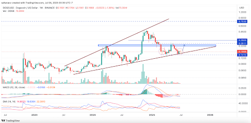 Interestingly, the weekly candle has just formed a bearish Doji pattern. Historically, this has been followed by a period of range-bound consolidation, a slight pullback, and then a substantial rise. Therefore, the Dogecoin (DOGE) price is expected to remain compressed between $0.165 and $0.177 for a period, followed by a strong move toward the resistance zone between $0.218 and $0.232. A breakout from this range could potentially propel the price to $0.25.