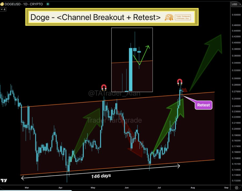 Analyst Trader Tardigrade highlighted that Dogecoin's price has recently broken through the upper boundary of a 146-day ascending parallel channel. This channel has guided DOGE's price movement since early March, characterized by consistently higher lows and a gradual squeeze towards the upper resistance level.
