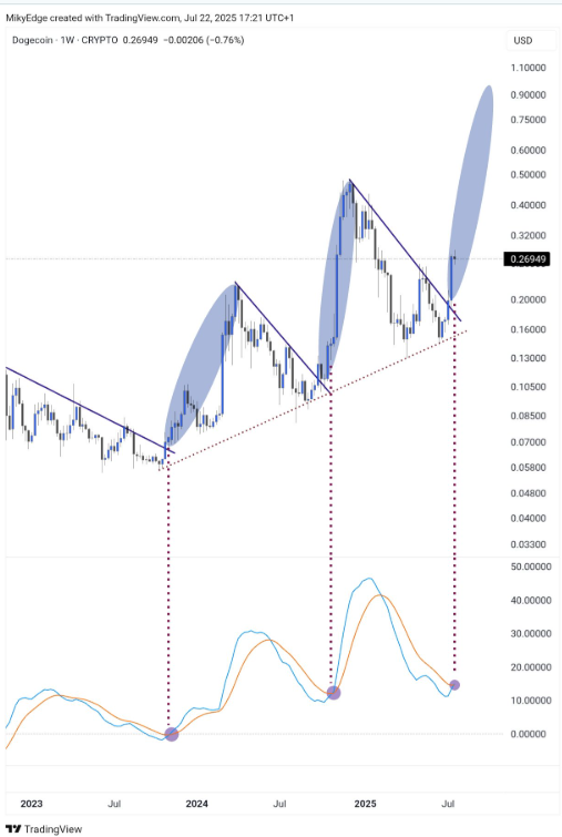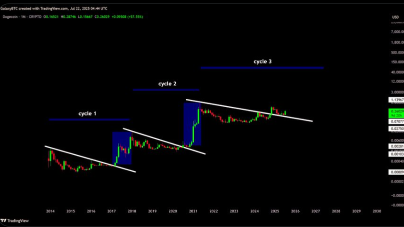 The wedge spanned over three years, extending from mid-2022 to mid-2025. This breakout marks the beginning of what the analyst terms "Cycle 3." Both previous cycles, initiated by wedge breakouts, led to new all-time highs. The technical structure and long-term chart symmetry suggest that Dogecoin's price may be entering an expansion phase. The historical pattern of breakout cycles provides a framework for projecting potential upside trajectories in the current phase.