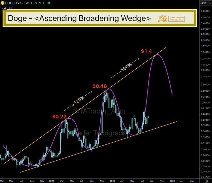 Zooming out of the 12-hour chart, an ascending broadening wedge is evident on the 1-week chart, suggesting an explosive price rally to $1.4.