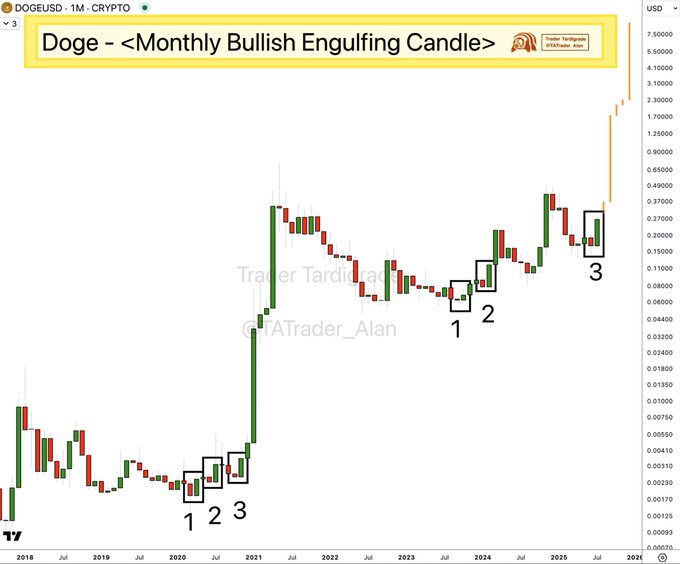 Market sentiment surrounding Dogecoin is becoming increasingly optimistic. A key indicator of this positive outlook is the formation of a bullish engulfing pattern on the monthly chart.