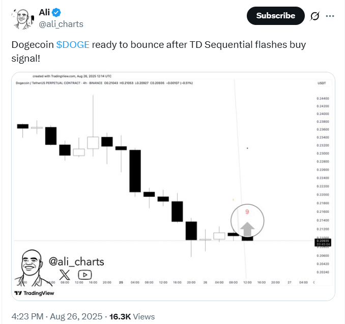 Dogecoin showed early signs of recovery on August 26, 2025, after a buy signal appeared on the TD Sequential indicator.