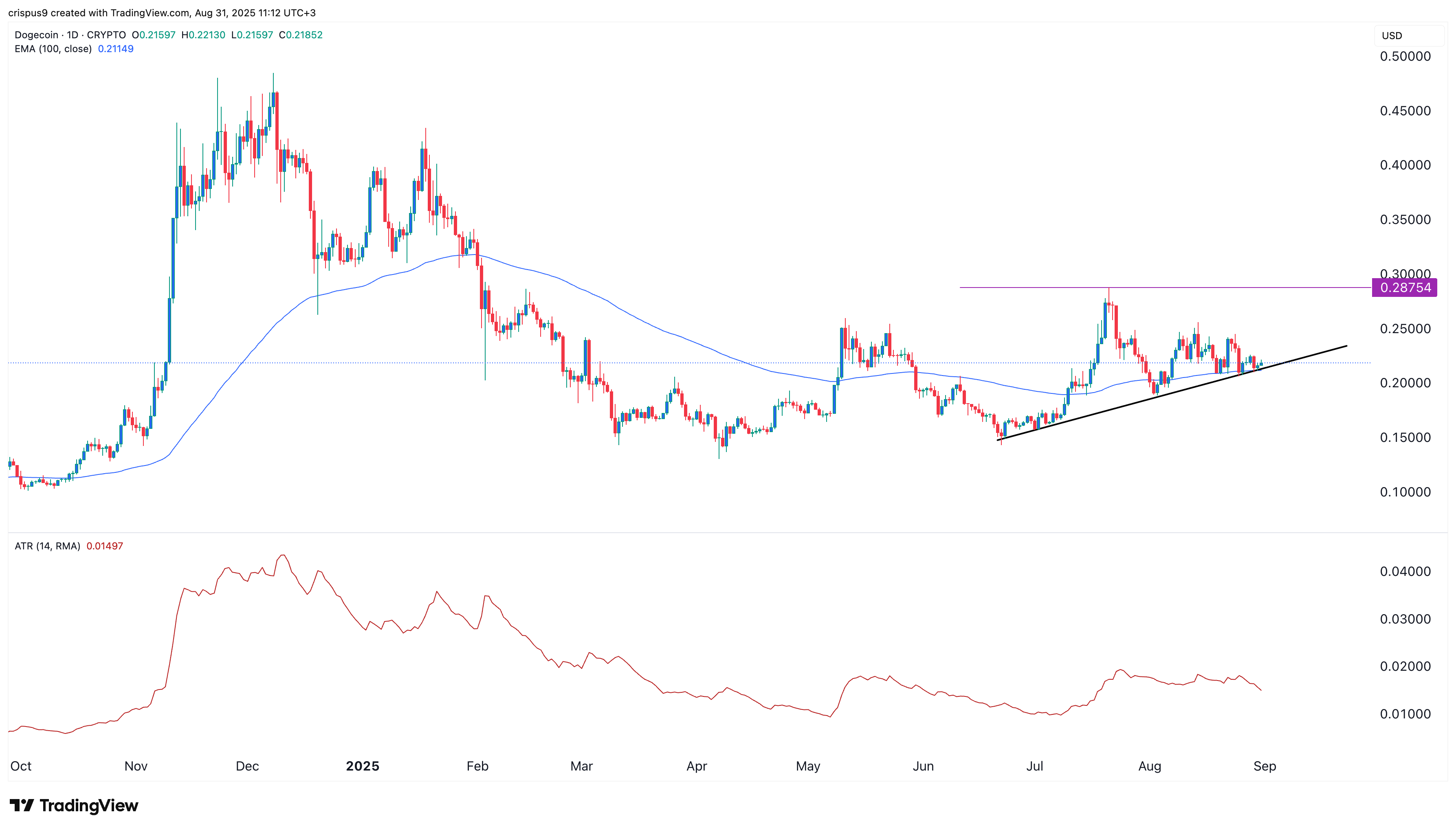 The daily timeframe chart shows that the DOGE price has come under pressure in the past few weeks. It moved from a high of $0.2875, its highest point in July.