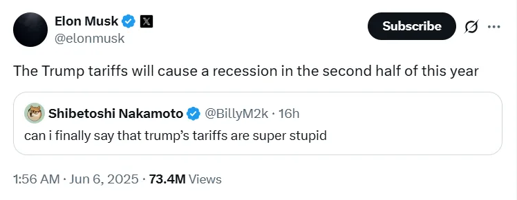 In a recent X post, Markus questioned Trump's tariffs, prompting Elon Musk to respond, "The Trump tariffs will cause a recession in the second half of this year."