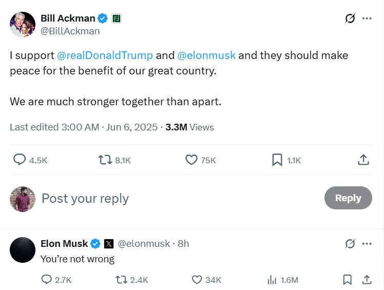Bill Ackman, a Trump supporter, recently advocated for "peace" between Trump and Musk, arguing that it would benefit the US. Musk responded to Ackman's statement with, "You're not wrong."