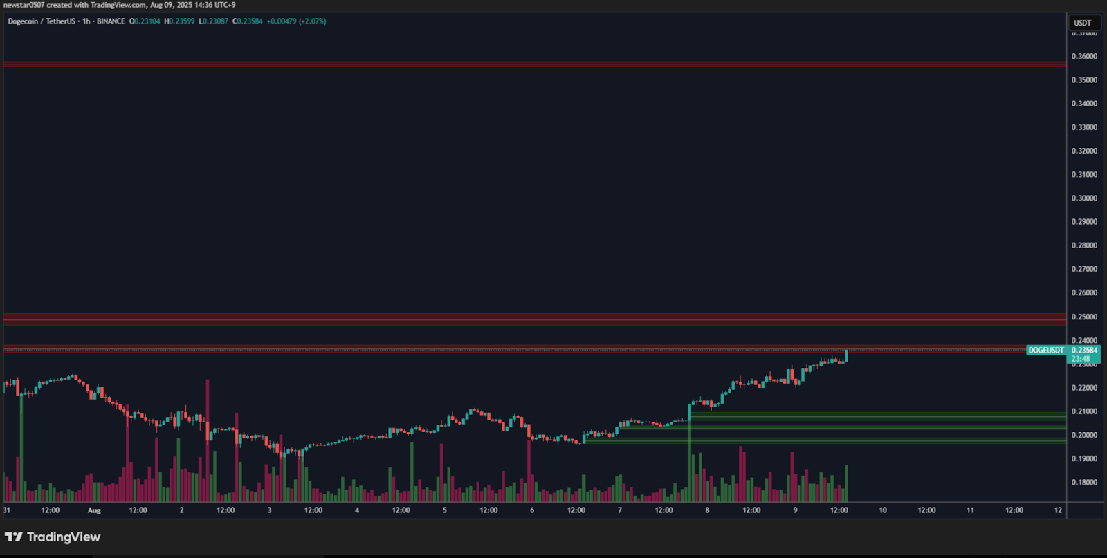 According to a 1-hour chart analysis, DOGE is facing resistance around the $0.24 mark, with a significant sell wall forming at $0.25. Conversely, strong buy support exists in the $0.20-$0.21 range, suggesting price accumulation during dips.