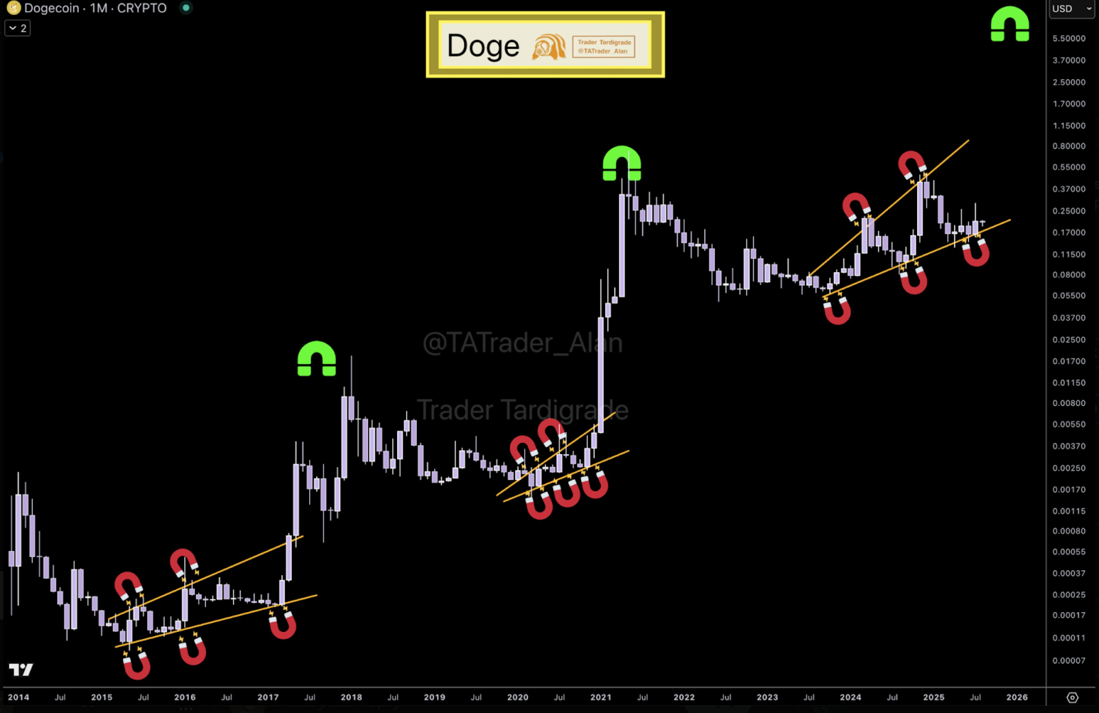 Crypto Patel echoes this outlook, pinpointing the $0.150 level as strong support and noting Dogecoin's price action within an ascending channel since mid-2022.