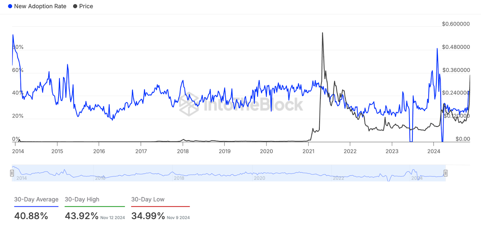 Network adoption rates remain stable, with a 30-day average of 40.88%. The most recent high was 43.92% in November 2024, and the low was 34.99% in the same month.