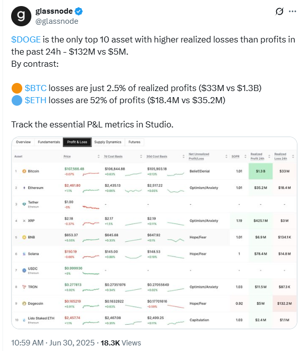 Data from Glassnode reveals that over the past 24 hours, DOGE has exhibited a marked imbalance in realized profit and loss. The memecoin recorded substantial realized losses of $132 million, compared to only $5 million in profits. This places Dogecoin ahead of both Bitcoin and Ethereum in terms of this particular metric.
