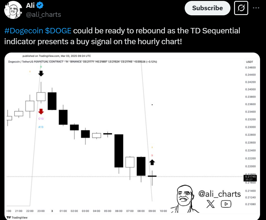 Analyst Ali Martinez highlights a buy signal from the TD Sequential indicator for Dogecoin. This typically precedes price growth within weeks. The indicator is crucial for identifying trend reversals, and a buy signal suggests strong potential for future price appreciation.