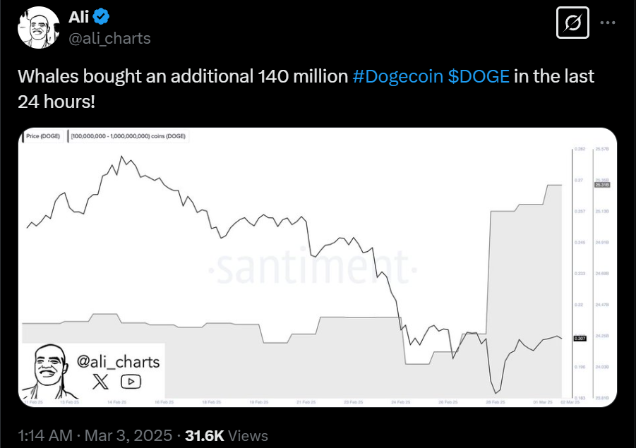 Over the past 24 hours, significant whale buyouts totaling 140 million Dogecoin have been observed. These large transactions coincided with Dogecoin's price increase, reflecting heightened interest from major investors. This substantial purchasing underscores investor confidence in Dogecoin's rising value, bolstering the existing bullish trend.