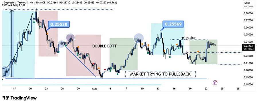 According to Ali Charts, Dogecoin has been trading within a symmetrical triangle on the 4-hour timeframe. The pattern began after DOGE rallied near $0.32 in mid-July and then retraced to $0.21 in late July.