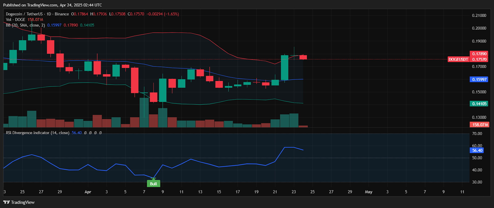Immediate resistance lies at the upper Bollinger Band and the previous consolidation range between $0.1800 and $0.1900. A daily close above this range could push the price towards $0.2000 and the late-March high of $0.2100. Failure to hold above $0.1800 could lead to a reversion to the mid-band around $0.1600, with secondary support at the lower band around $0.1410.