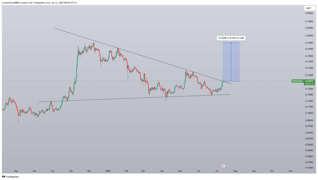 Crypto Charts anticipates that this breakout could propel Dogecoin's price towards $0.47. Achieving this target would represent a substantial increase of approximately 135% from the current breakout level. The projected price movement is clearly illustrated on the chart with a vertical arrow, visualizing the potential extent of the rally should it materialize.