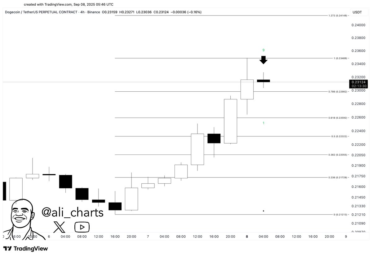A recent analysis highlighted the TD Sequential indicator flashing a sell signal on the 4-hour chart, suggesting that DOGE could face near-term resistance after its latest rally. Historically, this signal has marked local tops, often preceding short-term corrections.