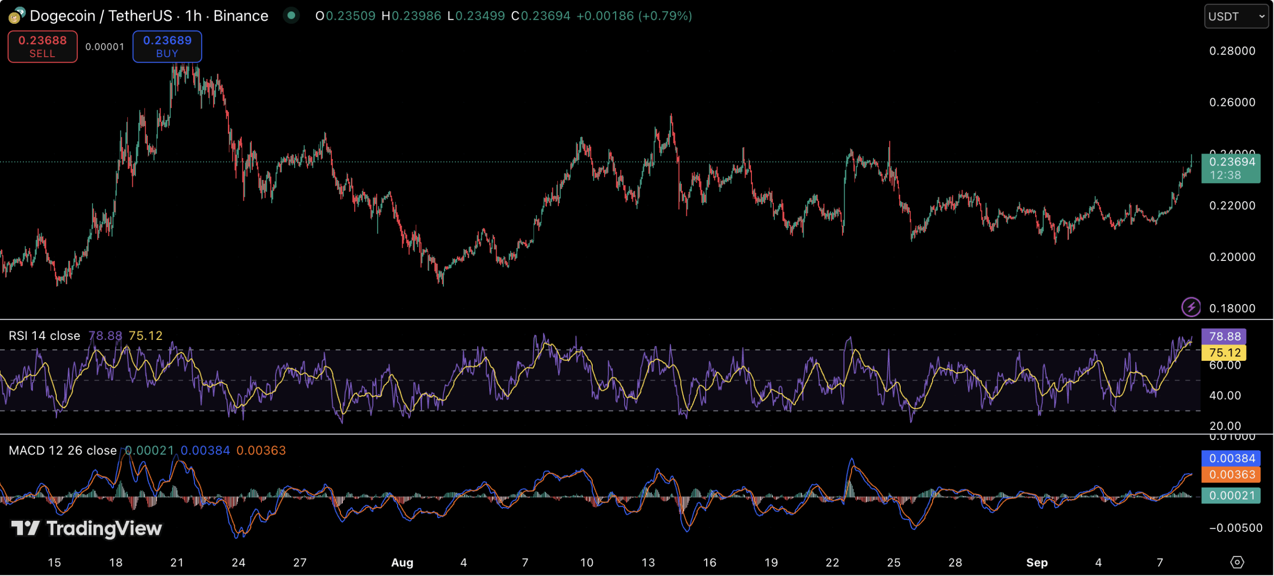 On the hourly chart, momentum appears stretched. The Relative Strength Index (RSI) has surged to 78, placing DOGE firmly in overbought territory. This increases the probability of profit-taking as traders reassess positions. Meanwhile, the Moving Average Convergence Divergence (MACD) indicator is still in positive territory, hinting at strong momentum, though crossovers could develop if selling pressure intensifies.