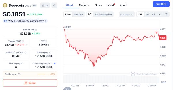Dogecoin is trading at around $0.1870, with a circulating supply of approximately 151.5 billion coins, according to CoinMarketCap.