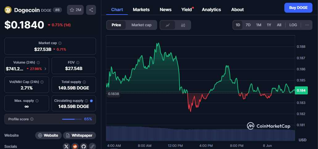At the time of writing, DOGE is trading at $0.1874, reflecting a modest daily gain of 1.11%, though overall momentum remains uncertain.